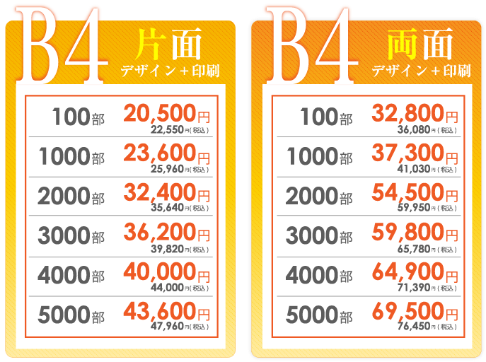 チラシデザイン作成、制作の強み 弊社の一番の強みは、低価格でハイクオリティーなチラシデザインの作成です。一般的な地元鹿児島のデザイン会社ですと、チラシデザイン代片面で3万~4万が相場だと思います。 確かに安い業者はあるのですが、クオリティー的にプロとは言えないレベルのデザインの作成をし、一万円以下で販売もしている業者もいますが、対応のスピードや作品の質に疑問を感じます。鹿児島チラシ作成.comではデザイナー全員が数年間の実務経験を経験しているデザイナーを多数抱えている為、低価格でのデザイン制作が可能になりました。 制作依頼前にラフデザインをご依頼者様に提出する為、お客様のイメージにより近いチラシのデザインを作成しております。よくお会いしてチラシデザインの打ち合わせをしたいというお客様もいらっしゃいますが、弊社は低価格での提供を考えておりますのでやり取りは、電話やメール、FAXなどで対応しております。また、 修正などもお客様がご納得していただくまで、何度でもチラシデザインの修正を承っております。 続いて、チラシデザインの制作スピードに関しましても、最短で当日・翌日仕上げの特急便、2~3日で完成するお急ぎ便の2種類をご用意しております。 チラシデザインの特急便はA4サイズの場合、片面34000円~でお受けしております。チラシデザインのお急ぎ便は片面25500円~でお受けしております。お急ぎの場合は、是非弊社の担当者までお気軽にお問合せいただければ幸いです。 スピードを求めないのでしたら、弊社で1番のお勧めはチラシ印刷パックをオススメしております。一番安いプランですと、チラシデザイン+印刷でA6サイズ100枚で税抜5980円からオススメしております。A4サイズでの最安パックは、チラシデザイン+印刷+送料込みで100枚で9,100円でお受けしております。 また他に何かわからないことがございましたらなんなりとお気軽にお問合せください。