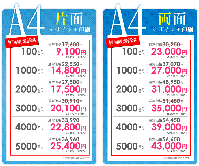 チラシデザイン作成、制作の強み 弊社の一番の強みは、低価格でハイクオリティーなチラシデザインの作成です。一般的な地元鹿児島のデザイン会社ですと、チラシデザイン代片面で3万~4万が相場だと思います。 確かに安い業者はあるのですが、クオリティー的にプロとは言えないレベルのデザインの作成をし、一万円以下で販売もしている業者もいますが、対応のスピードや作品の質に疑問を感じます。鹿児島チラシ作成.comではデザイナー全員が数年間の実務経験を経験しているデザイナーを多数抱えている為、低価格でのデザイン制作が可能になりました。 制作依頼前にラフデザインをご依頼者様に提出する為、お客様のイメージにより近いチラシのデザインを作成しております。よくお会いしてチラシデザインの打ち合わせをしたいというお客様もいらっしゃいますが、弊社は低価格での提供を考えておりますのでやり取りは、電話やメール、FAXなどで対応しております。また、 修正などもお客様がご納得していただくまで、何度でもチラシデザインの修正を承っております。 続いて、チラシデザインの制作スピードに関しましても、最短で当日・翌日仕上げの特急便、2~3日で完成するお急ぎ便の2種類をご用意しております。 チラシデザインの特急便はA4サイズの場合、片面34000円~でお受けしております。チラシデザインのお急ぎ便は片面25500円~でお受けしております。お急ぎの場合は、是非弊社の担当者までお気軽にお問合せいただければ幸いです。 スピードを求めないのでしたら、弊社で1番のお勧めはチラシ印刷パックをオススメしております。一番安いプランですと、チラシデザイン+印刷でA6サイズ100枚で税抜5980円からオススメしております。A4サイズでの最安パックは、チラシデザイン+印刷+送料込みで100枚で9,100円でお受けしております。 また他に何かわからないことがございましたらなんなりとお気軽にお問合せください。