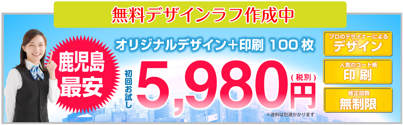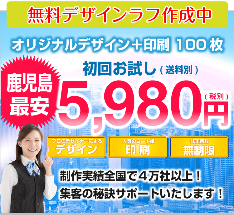 チラシデザイン+印刷で、税抜5980円鹿児島県下最安値に挑戦!!チラシお急ぎ納期OK最短納期当日仕上げ対応中!! 鹿児島県下同業他社より1円でも高い場合はご相談ください!!誠心誠意対応させて頂きます。チラシのことなら鹿児島チラシ作成.com!