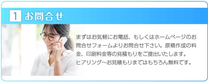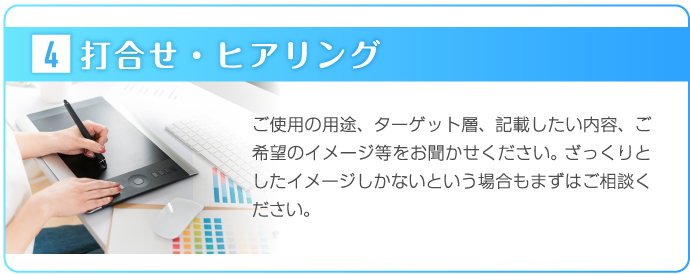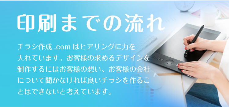 鹿児島チラシ作成.comでは、お客様の思いを形にするため、ヒアリングに力をいれております。何を伝えていいかわからないという方も多いかと思いますが、好きな色、思い、こんなことをしたいなど、ざっくりとしたイメージで構いませんので、担当スタッフにお伝えください。それを形にするのがプロの私たちの仕事ですので、安心してお任せしていただければと思います。